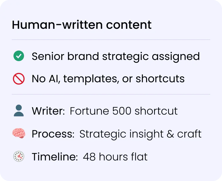 AI can’t capture what makes your brand unique. Our human content creators spent years learning brand strategy and have worked with the world’s biggest companies. The difference shows in the quality.